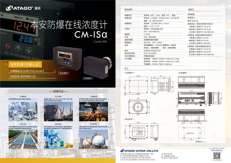 ATAGO(愛拓)在線折光儀 CM-ISα(本安防爆型),適用於需要在防爆環境下等各類危險場所使用的各類液體在線濃度監測需求,尤其是各類化工行業的液體濃度在線監測。