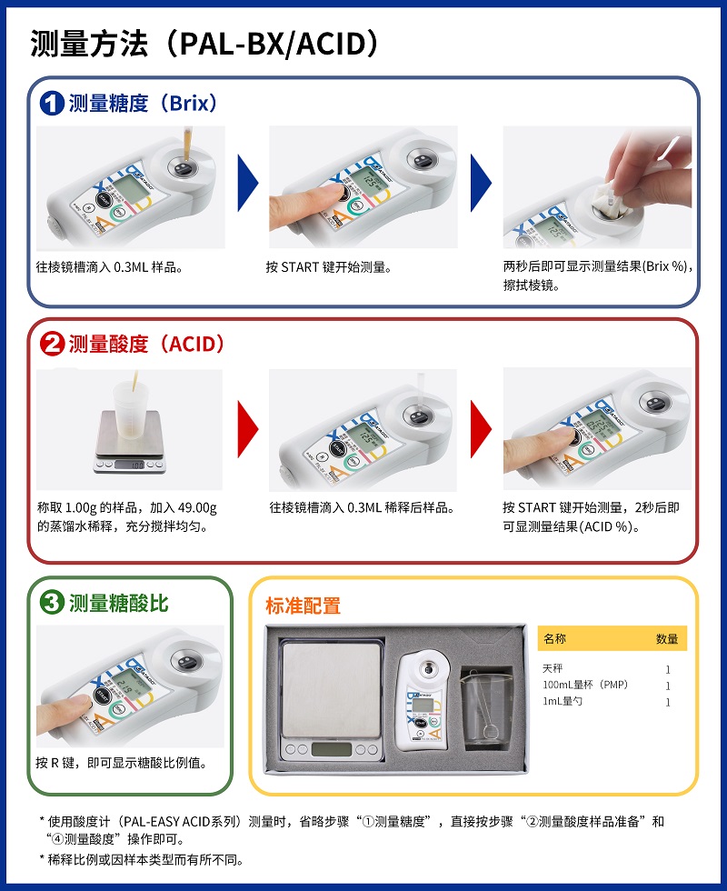 使用ATAGO(愛拓)糖酸度計,糖度可直接取樣測量;酸度測量隻需添加蒸餾水與測量樣品按重量比例(1:50)稀釋(即:果汁1.00g,蒸餾水49.00g)攪拌均勻後即可取樣測量。糖度及酸度測量完成後,按R鍵自動顯示糖酸比。